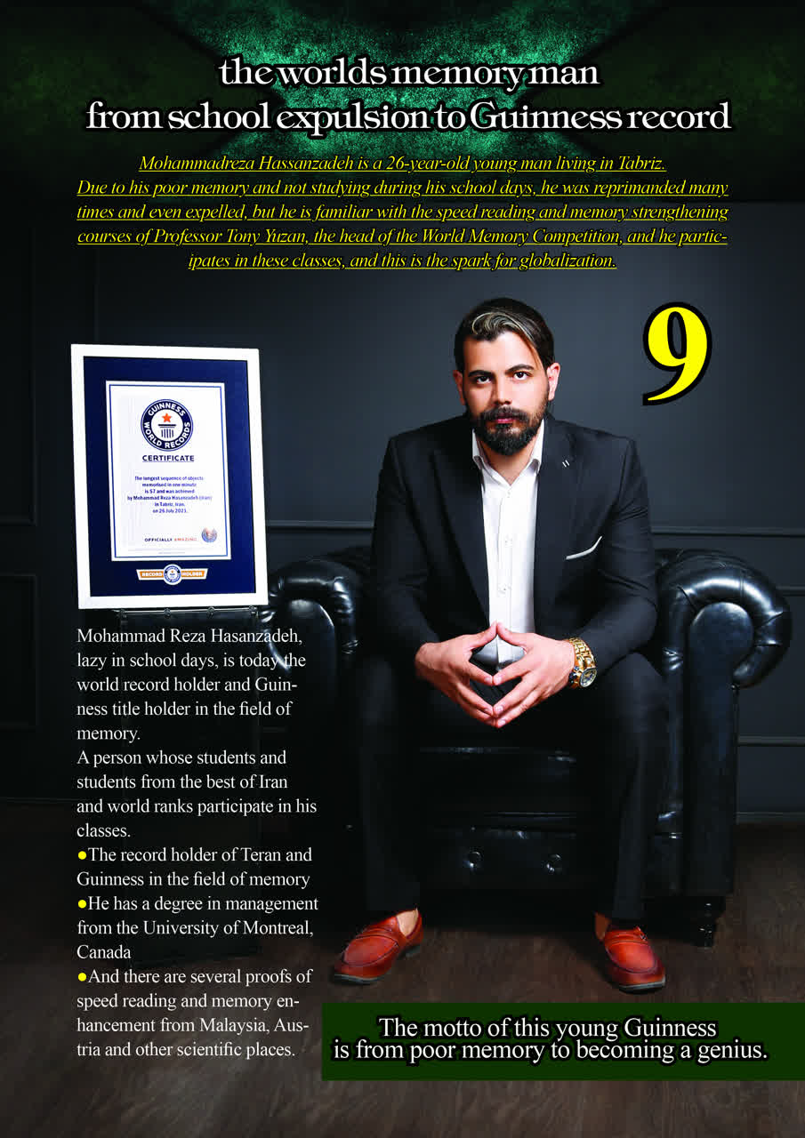 به گزارش خبرنگار ما, محمدرضا حسن زاده, وی به دلیل حافظه ضعیف و درس نخواندن در دوران مدرسه بارها مورد تذکر و حتی اخراج قرار گرفت اما به طور قابل توجهی با دوره های تند خوانی و تقویت حافظه پرفسور تونی یوزان رئیس مسابقات جهانی حافظه آشنا و در این کلاس ها شرکت می کند و همین جرقه ای برای جهانی شدن محمدرضا حسن زاده شد.